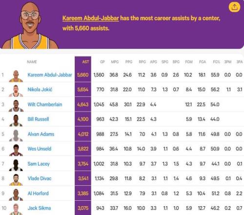 在前两节比赛中,约基奇得到了15分4篮板9助攻1抢断。这样一来,约基奇已经完成了对于传奇中锋贾巴尔的超越,正式成为NBA历史助攻最多的中锋。本场比赛赛前,约基奇距离贾巴尔仅差6助攻。